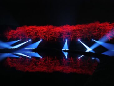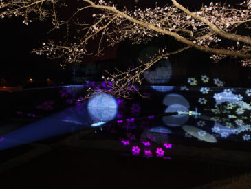 湧水町稲葉埼の国道268号線沿いには、旧山野線跡の桜並木があり、昼間はもちろん、夜のライトアップも人気です。19:30から1時間程度は音楽に合わせたライトショーがあり、田んぼの水に反射する様子が幻想的。