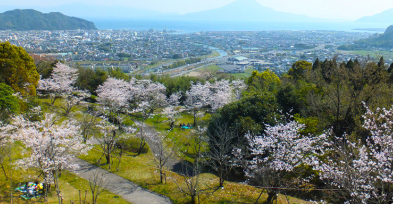 姶良市の標高155mの高台にある高岡公園は、錦江湾と桜島、姶良市街地を一望できる絶景スポット。