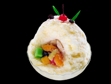 前田さん: 豆知識一つ目は現在では全国のコンビニで買えたり、チョコ味、マンゴー味など「白くない白熊」もありますよね。実は「天文館むじゃき」では、あえて「氷白熊」の商標登録をしていないんです。だからこそ、いろんなお店から個性豊かな“白熊”が誕生して、鹿児島を代表するスイーツとして皆さんに定着したのかな、なんて思っています。二つ目は、年に一度、6月の「白熊誕生祭」の期間だけ食べられる「なつかしろくま」をご存知ですか?これは販売当時のスタイルを再現した初期メニューで、氷の中に果物を入れ、外側にアンゼリカ、チェリー、レーズンをトッピングしています。これがちょうど「白熊の顔」に見えたことから、名前が「白熊」になったんですよ。